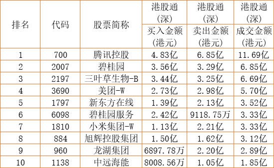 港股通(深)买卖前十股(单位:港元):