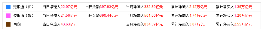 今日,南下资金净流入43.63亿港元,其中港股通(沪)净流入22.07亿港元,港股通(深)净流入21.56亿港元。