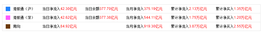 今日,南下资金净流入84.92亿港元,其中港股通(沪)净流入42.30亿港元,港股通(深)净流入42.62亿港元。