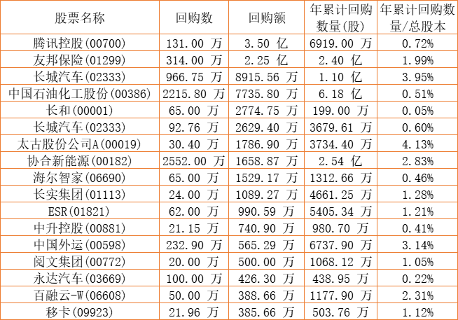 富智康集团(02038)、永安国际(00289)、摩比发展(00947)、阅文集团(00772)、彩星集团(00635)、胜狮货柜(00716)、德祥地产(00199)、酷派集团(02369)、佐丹奴国际(00709)、朗生医药(00503)、东亚银行(00023)、完美医疗(01830)、中国外运(00598)、天福(06868)、亿胜生物科技(01061)、百融云-W(06608)、清科创业(01945)、中国石油化工股份(00386)、康健国际医疗(03886)、上海石油化工股份(00338)、新鸿基公司(00086)、泡泡玛特(09992)、友邦保险(01299)、兴胜创建(00896)、民银资本(01141)、长城汽车(02333)、腾讯控股(00700)、天伦燃气(01600)、信利国际(00732)、太古股份公司A(00019)、太古股份公司B(00087)、美亨实业(01897)、易大宗(01733)、亿都(国际控股)(00259)、中远海运国际(00517)、长实集团(01113)、东软教育(09616)、长和(00001)、长城汽车(02333)、ESR(01821)、移卡(09923)、海尔智家(06690)、汇量科技(01860)、康圣环球(09960)、永达汽车(03669)、中升控股(00881)、协合新能源(00182)、康基医疗(09997)于2022年11月28日进行了回购。其中,回购金额最大的为腾讯控股(00700),回购数量131.00 万,回购金额3.50 亿元。