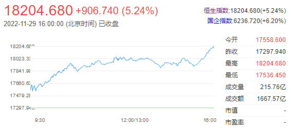 港股三大指数尾盘涨幅进一步加大,恒指涨5.24%上扬905点,收复18000关口,国指涨6.2%,恒生科技指数更是大涨7.66%。港股后市展望:光大策略表示,港股当前拐点已至,未来若得到经济数据的验证港股市场有望继续上涨。向后看,随着我国防疫政策的进一步优化以及地产利好政策带动地产行业逐步修复,我国经济有望进一步企稳回升,11、12月的经济数据或将底部回升。