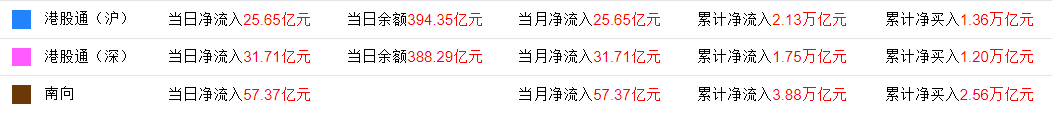 今日,南下资金净流入57.36亿港元,其中港股通(沪)净流入25.65亿港元,港股通(深)净流入31.71亿港元。