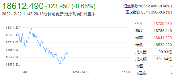 今日港股低开低走,截至午盘,恒生指数(18581.93 -154.51 -0.82%)跌0.66%,报18612.49点;国企指数跌0.63%,红筹指数跌1.46%。