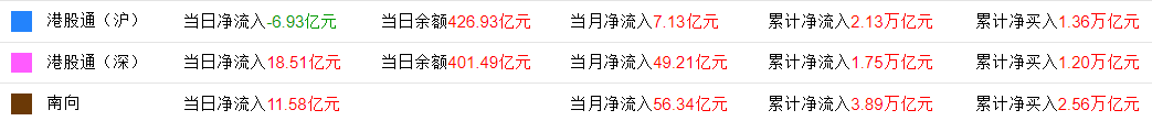 今日,南下资金净流入11.58亿港元,其中港股通(沪)净流入-6.93亿港元,港股通(深)净流入18.51亿港元。