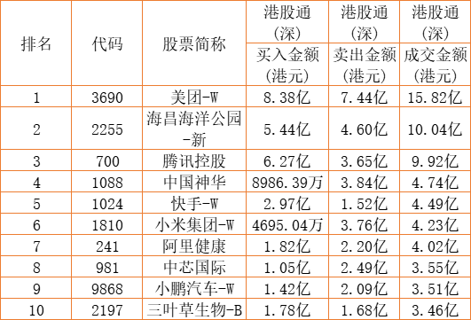 亚汇网实时数据统计:截至12月2日收盘,腾讯控股、美团-W、国美零售位居港股通(沪)成交前三,美团-W、海昌海洋公园-新、腾讯控股位居股通(深)成交前三。
