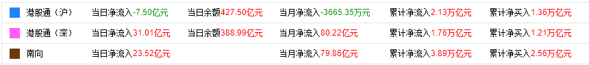 今日,南下资金净流入23.52亿港元,其中港股通(沪)净流出7.49亿港元,港股通(深)净流入31.01亿港元。。