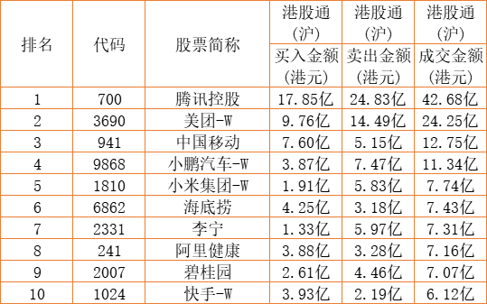 港股通(沪)买卖前十股(单位:港元):