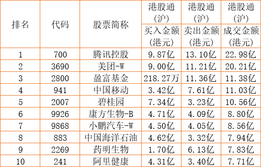 港股通(沪)买卖前十股(单位:港元):
