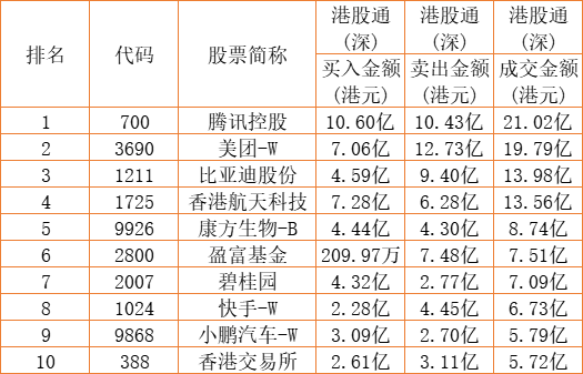 港股通(深)买卖前十股(单位:港元):