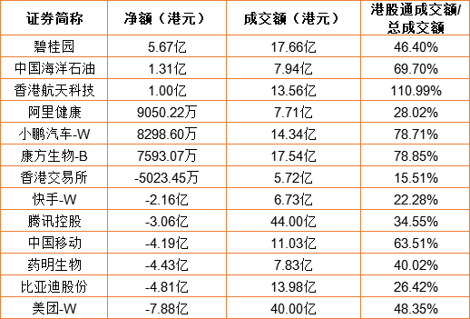 亚汇网12月7日港股通数据统计显示:碧桂园净买入额居首,达5.67亿港元,美团-W净卖出额居第一位。(亚汇网编辑:陌尘)