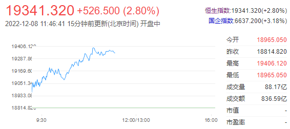 港股三大指数午间集体收涨,恒指涨0.15%,恒科指涨1.37%,国指涨0.23%。南下资金半日净流入15.88亿港元,大市成交额为903亿港元。