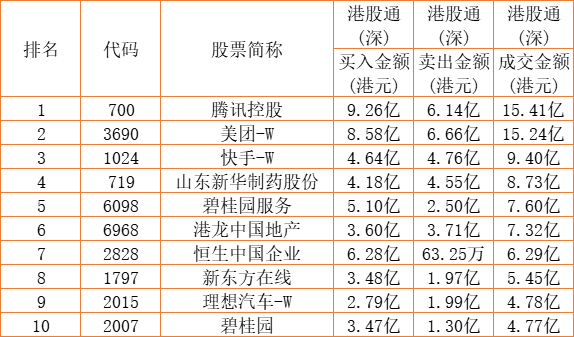 港股通(深)买卖前十股(单位:港元):