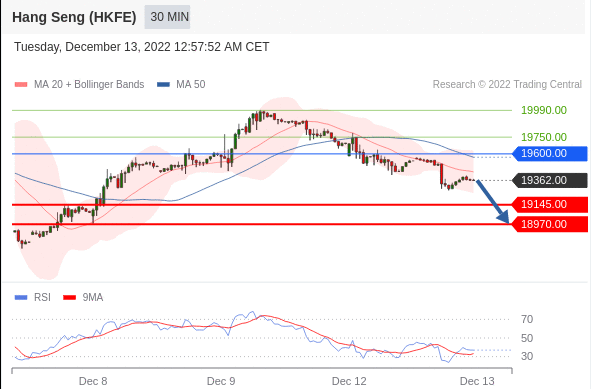 交易策略: 在 19600.00 之下,看跌,目标价位为 19145.00 ,然后为 18970.00 。