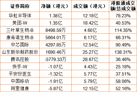 亚汇网12月14日港股通数据统计显示:华虹半导体净买入额居首,达1.38亿港元,阿里健康净卖出额居第一位。(亚汇网编辑:陌尘)