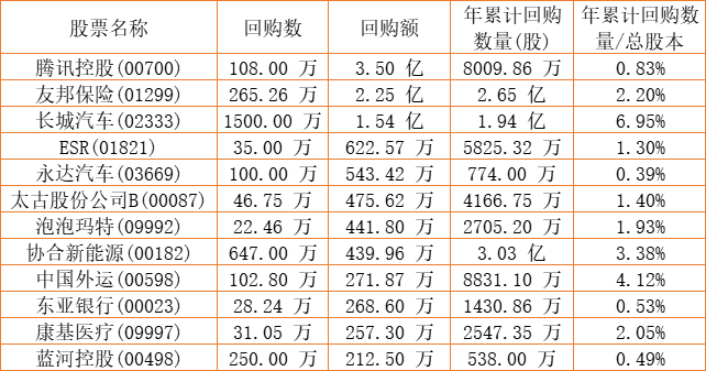 德祥地产(00199)、摩比发展(00947)、长城汽车(02333)、中国外运(00598)、东亚银行(00023)、兴胜创建(00896)、清科创业(01945)、金利来集团(00533)、康健国际医疗(03886)、朗生医药(00503)、腾讯控股(00700)、太古股份公司B(00087)、友邦保险(01299)、上海石油化工股份(00338)、亿都(国际控股)(00259)、酷派集团(02369)、蓝河控股(00498)、泡泡玛特(09992)、民银资本(01141)、天伦燃气(01600)、百融云-W(06608)、易大宗(01733)、永达汽车(03669)、移卡(09923)、康圣环球(09960)、汇量科技(01860)、圣诺医药-B(02257)、ESR(01821)、协合新能源(00182)、北京能源国际(00686)、康基医疗(09997)于2022年12月14日进行了回购。其中,回购金额最大的为腾讯控股(00700),回购数量108.00 万,回购金额3.50 亿元。