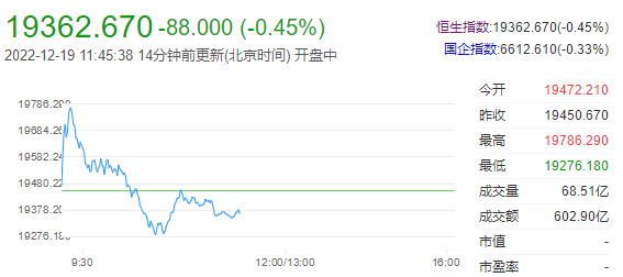 12月19日消息,美股上周五继续下挫。今日港股恒指开涨0.11%,截至午盘,恒生指数(19349.42 -101.25 -0.52%)跌0.45%,报19362.67点;国企指数跌0.33%,红筹指数跌1.56%。