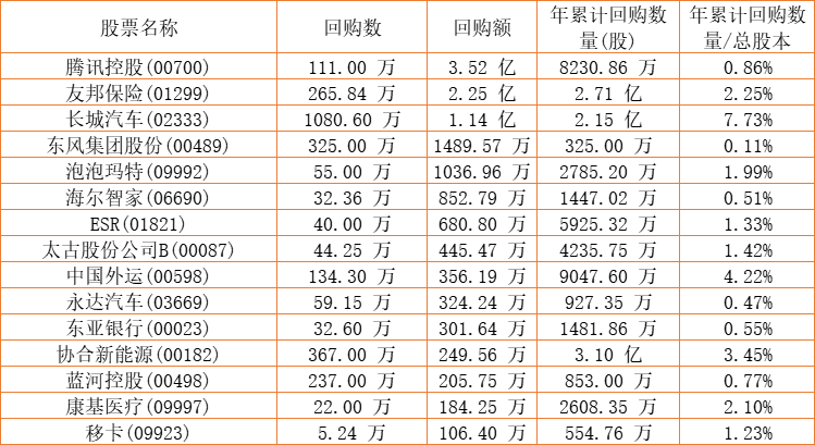 朗生医药(00503)、长城汽车(02333)、富智康集团(02038)、东亚银行(00023)、摩比发展(00947)、泡泡玛特(09992)、中国外运(00598)、兴胜创建(00896)、清科创业(01945)、酷派集团(02369)、蓝河控股(00498)、上海石油化工股份(00338)、天伦燃气(01600)、天福(06868)、亿都(国际控股)(00259)、康健国际医疗(03886)、腾讯控股(00700)、美亨实业(01897)、百融云-W(06608)、太古股份公司B(00087)、易大宗(01733)、海尔智家(06690)、汇量科技(01860)、友邦保险(01299)、移卡(09923)、协合新能源(00182)、康圣环球(09960)、东风集团股份(00489)、永达汽车(03669)、北京能源国际(00686)、ESR(01821)、康基医疗(09997)、上实城市开发(00563)于2022年12月16日进行了回购。其中,回购金额最大的为腾讯控股(00700),回购数量111.00 万,回购金额3.52 亿元。