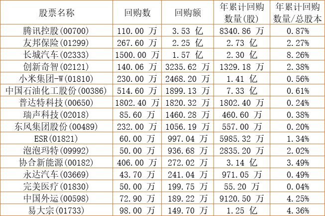 景福集团(00280)、中国外运(00598)、长城汽车(02333)、东亚银行(00023)、康健国际医疗(03886)、泡泡玛特(09992)、佐丹奴国际(00709)、和谐汽车(03836)、天福(06868)、清科创业(01945)、腾讯控股(00700)、亿都(国际控股)(00259)、中国石油化工股份(00386)、兴胜创建(00896)、蓝河控股(00498)、友邦保险(01299)、美亨实业(01897)、太古股份公司B(00087)、上海石油化工股份(00338)、天伦燃气(01600)、创新奇智(02121)、汇量科技(01860)、东风集团股份(00489)、完美医疗(01830)、小米集团-W(01810)、瑞声科技(02018)、圣诺医药-B(02257)、移卡(09923)、普达特科技(00650)、永达汽车(03669)、易大宗(01733)、协合新能源(00182)、北京能源国际(00686)、康圣环球(09960)、ESR(01821)于2022年12月19日进行了回购。其中,回购金额最大的为腾讯控股(00700),回购数量110.00 万,回购金额3.53 亿元。