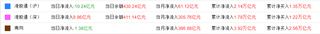 今日,南下资金净流出1.39亿港元,其中港股通(沪)净流出10.24亿港元,港股通(深)净流入8.85亿港元。
