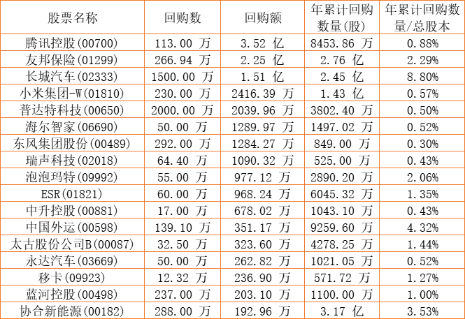 长城汽车(02333)、朗生医药(00503)、摩比发展(00947)、中国外运(00598)、东亚银行(00023)、东风集团股份(00489)、泡泡玛特(09992)、天福(06868)、亚洲金融(00662)、腾讯控股(00700)、亿都(国际控股)(00259)、兴胜创建(00896)、瑞声科技(02018)、天伦燃气(01600)、蓝河控股(00498)、民银资本(01141)、普达特科技(00650)、新鸿基公司(00086)、太古股份公司B(00087)、上海石油化工股份(00338)、友邦保险(01299)、美亨实业(01897)、清科创业(01945)、汇量科技(01860)、协合新能源(00182)、永达汽车(03669)、小米集团-W(01810)、海尔智家(06690)、康健国际医疗(03886)、移卡(09923)、北京能源国际(00686)、圣诺医药-B(02257)、康圣环球(09960)、中升控股(00881)、ESR(01821)、上实城市开发(00563)、康基医疗(09997)于2022年12月20日进行了回购。其中,回购金额最大的为腾讯控股(00700),回购数量113.00 万,回购金额3.52 亿元。