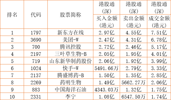 港股通(深)买卖前十股(单位:港元):