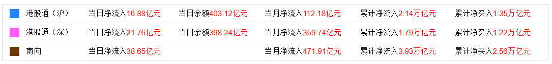 今日,南下资金净流入38.65亿港元,港股通(沪)净流入16.88亿港元,港股通(深)净流入21.76亿港元。