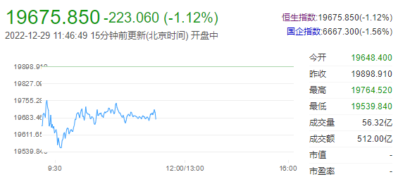 12月29日,港股半天下来,指数低位震荡。恒生指数跌1.12%,报收19675.85点;恒生科技指数跌2.59%,报收4103.52点。