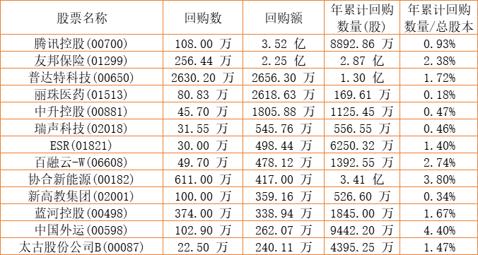 朗生医药(00503)、中国外运(00598)、摩比发展(00947)、景福集团(00280)、天福(06868)、清科创业(01945)、瑞声科技(02018)、东亚银行(00023)、富智康集团(02038)、兴胜创建(00896)、民银资本(01141)、太古股份公司B(00087)、腾讯控股(00700)、普达特科技(00650)、天伦燃气(01600)、亿都(国际控股)(00259)、蓝河控股(00498)、圣诺医药-B(02257)、友邦保险(01299)、佐丹奴国际(00709)、新高教集团(02001)、汇量科技(01860)、百融云-W(06608)、协合新能源(00182)、ESR(01821)、丽珠医药(01513)、中升控股(00881)、康圣环球(09960)、浦江国际(02060)于2022年12月28日进行了回购。其中,回购金额最大的为腾讯控股(00700),回购数量108.00 万,回购金额3.52 亿元。