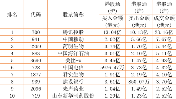 港股通(沪)买卖前十股(单位:港元):