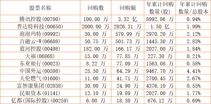 富智康集团(02038)、泡泡玛特(09992)、摩比发展(00947)、腾讯控股(00700)、天福(06868)、东亚银行(00023)、中国外运(00598)、亿都(国际控股)(00259)、清科创业(01945)、普达特科技(00650)、兴胜创建(00896)、百融云-W(06608)、民银资本(01141)、蓝河控股(00498)、天伦燃气(01600)于2022年12月29日进行了回购。其中,回购金额最大的为腾讯控股(00700),回购数量100.00 万,回购金额3.32 亿元。