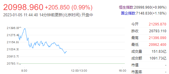1月5日,港股半天下来,指数冲高回落,恒生指数涨1.01%,报收21003.12点;恒生科技指数涨1.08%,报收4474.82点。