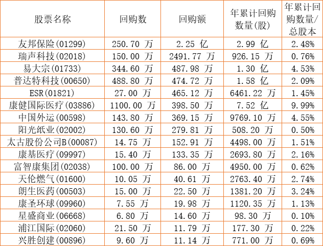 富智康集团(02038)、朗生医药(00503)、摩比发展(00947)、兴胜创建(00896)、康健国际医疗(03886)、亿都(国际控股)(00259)、清科创业(01945)、普达特科技(00650)、友邦保险(01299)、阳光纸业(02002)、中国外运(00598)、天伦燃气(01600)、瑞声科技(02018)、太古股份公司B(00087)、乐声电子(00213)、易大宗(01733)、康圣环球(09960)、ESR(01821)、康基医疗(09997)、星盛商业(06668)、浦江国际(02060)于2023年1月5日进行了回购。其中,回购金额最大的为友邦保险(01299),回购数量250.70 万,回购金额2.25 亿元。