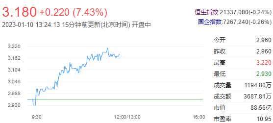 今日走势分析:天工国际(00826)再度冲高,早盘升约8%。截至发稿,天工国际涨7.77%,报3.19港元,成交额0.33亿港元。