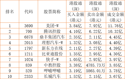 亚汇网实时数据统计:截至1月10日收盘,美团-W、腾讯控股、国美零售位居港股通(沪)成交前三,腾讯控股、美团-W、鼎丰集团汽车位居股通(深)成交前三。