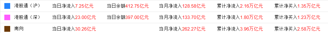 今日,南下资金净流入30.25亿港元,其中港股通(沪)净流入7.25亿港元,港股通(深)净流入23亿港元。