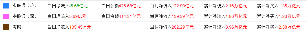 今日,南下资金净流入0.01亿港元,其中港股通(沪)净流出5.68亿港元,港股通(深)净流入5.69亿港元。