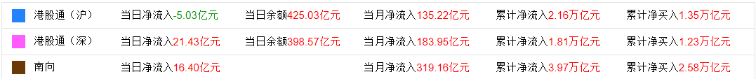 今日,南下资金净流入16.40亿港元,其中港股通(沪)净流出5.02亿港元,港股通(深)净流入21.42亿港元。