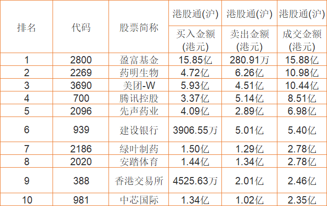 港股通(沪)买卖前十股(单位:港元):