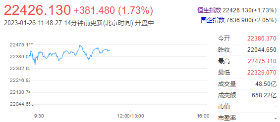今日开盘,港股恒指高开1.55%,随后涨幅扩大。截至午间收盘,恒生指数(22434 389.35 1.77%)涨1.73%,报22426.13点;国企指数涨2.05%,红筹指数涨0.75%。