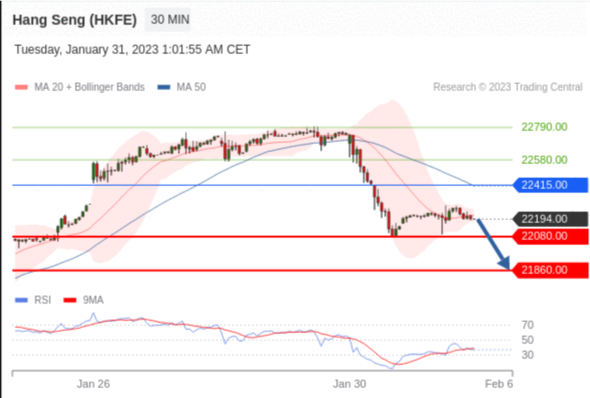 交易策略: 在 22415.00 之下,看跌,目标价位为 22080.00 ,然后为 21860.00 。