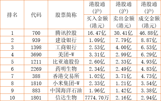 港股通(沪)买卖前十股(单位:港元):