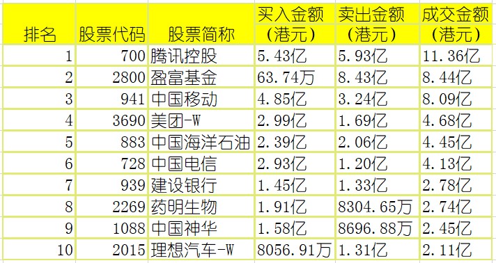 亚汇网实时数据统计:截至3月9日收盘,腾讯控股、盈富基金、中国移动(沪)成交前三,盈富基金、腾讯控股、美团-W(深)成交前三。