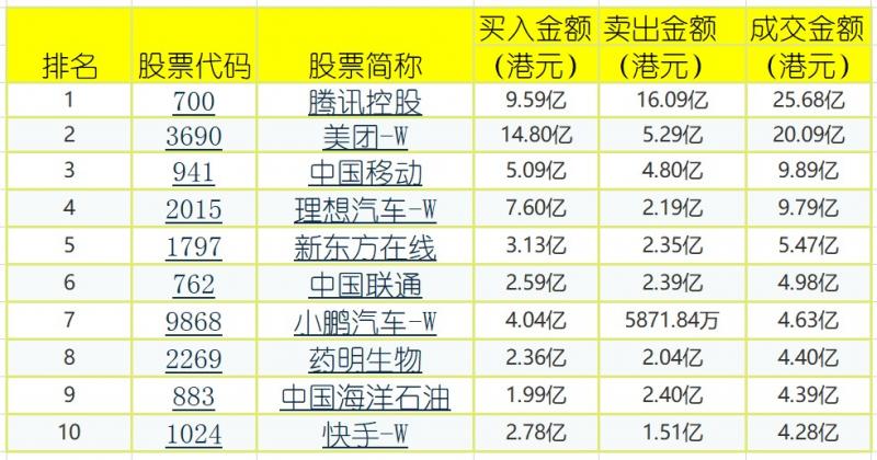 亚汇网实时数据统计:截至3月10日收盘,腾讯控股、美团-W、中国移动(沪)成交前三,腾讯控股、美团-W、中国移动(深)成交前三。