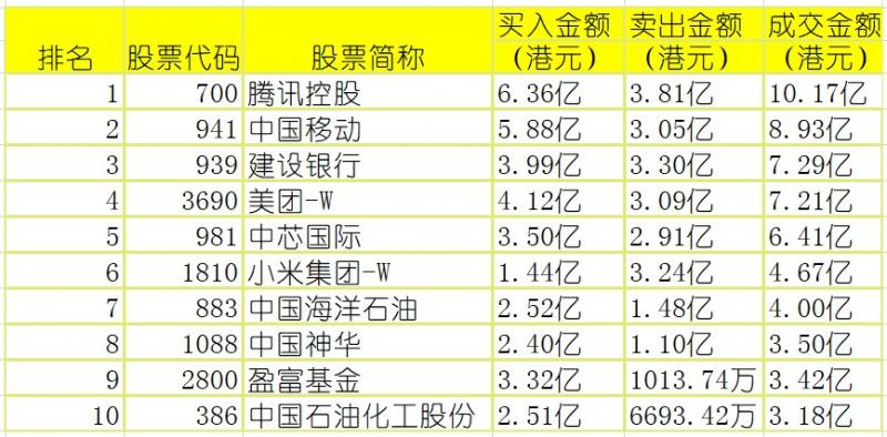 港股通(沪)买卖前十股(单位:港元):