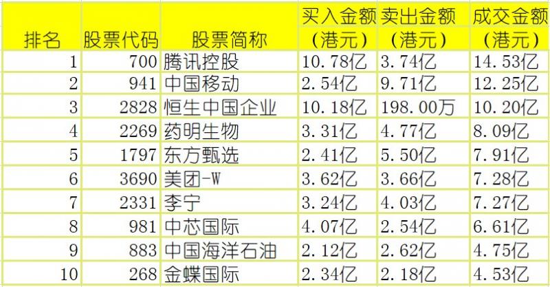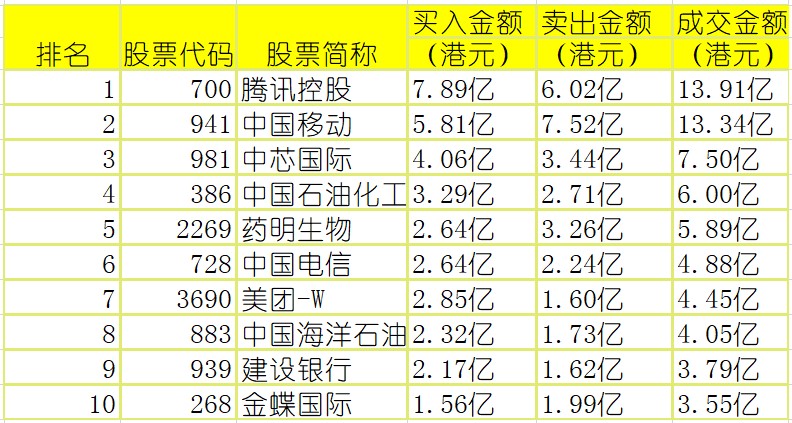 港股通(沪)买卖前十股(单位:港元):