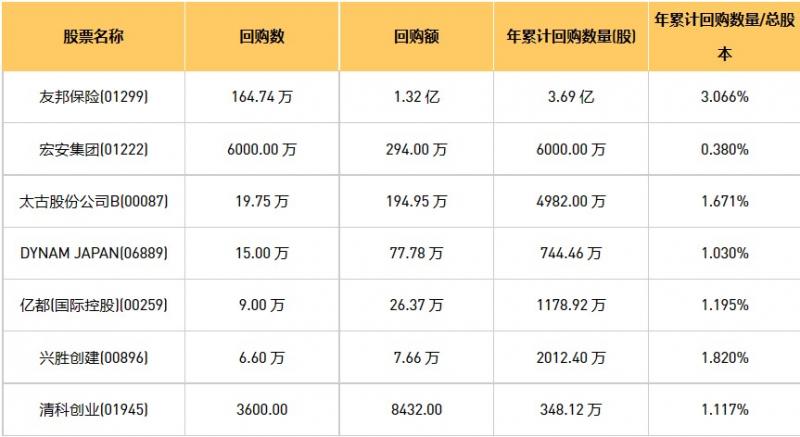 DYNAM JAPAN(06889)、友邦保险(01299)、宏安集团(01222)、兴胜创建(00896)、亿都(国际控股)(00259)、太古股份公司B(00087)、清科创业(01945)于2023年3月22日进行了回购。其中,回购金额最大的为友邦保险(01299),回购数量164.74 万,回购金额1.32 亿元。