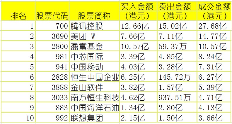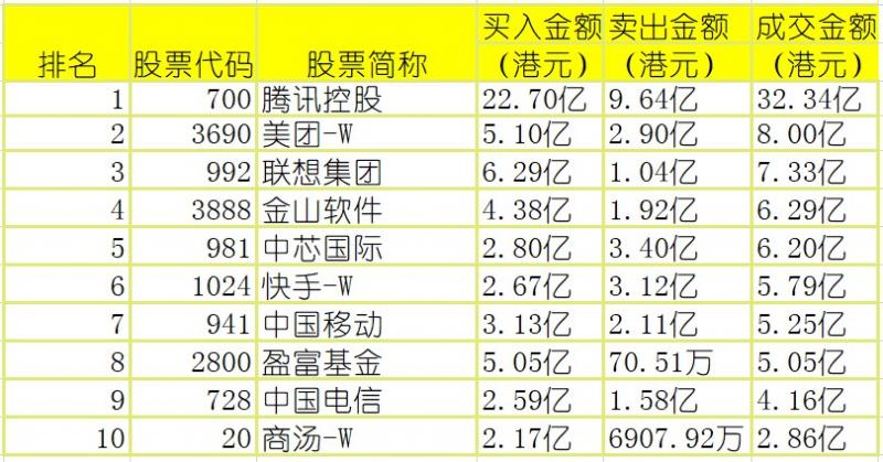 港股通(沪)买卖前十股(单位:港元):