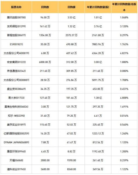 宏安集团(01222)、DYNAM JAPAN(06889)、天福(06868)、亿都(国际控股)(00259)、腾讯控股(00700)、昊海生物科技(06826)、京信通信(02342)、清科创业(01945)、友邦保险(01299)、首程控股(00697)、太古股份公司A(00019)、ESR(01821)、美亨实业(01897)、太古股份公司B(00087)、盛业资本(08469)、易大宗(01733)、康圣环球(09960)、知乎-W(02390)于2023年3月28日进行了回购。其中,回购金额最大的为腾讯控股(00700),回购数量94.00 万,回购金额3.53 亿元。