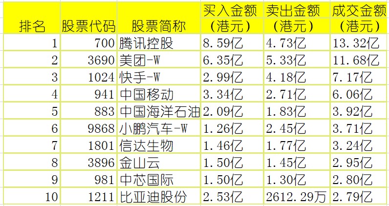 港股通(沪)买卖前十股(单位:港元):