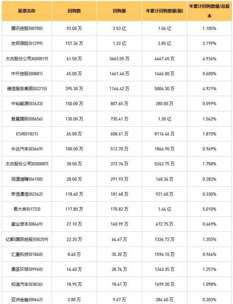 首程控股(00697)、亚洲金融(00662)、亿都(国际控股)(00259)、天福(06868)、和谐汽车(03836)、友邦保险(01299)、太古股份公司A(00019)、盛业资本(08469)、汇量科技(01860)、腾讯控股(00700)、太古股份公司B(00087)、清科创业(01945)、京信通信(02342)、中裕能源(03633)、同道猎聘(06100)、中升控股(00881)、摩比发展(00947)、易大宗(01733)、复星国际(00656)、德信服务集团(02215)、新时代能源(00166)、ESR(01821)、永达汽车(03669)、康圣环球(09960)于2023年4月6日进行了回购。其中,回购金额最大的为腾讯控股(00700),回购数量92.00 万,回购金额3.53 亿元。
